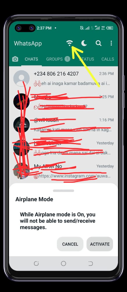 Da farko dai zaka shiga cikin normal whatsapp ko Gb-whatsapp naka kana shiga babu abinda zakayi saika duba saman Whatsap dinka zakaga wata ‘yar alama kamar ta wi-fi haka zaka ganta kawai saika tabata kana tabata zata iyoma wani rubuta tana mai tambayarka kanaso kasa whatsapp dinka a offline kawai zakaga daga kasa ansa Cancel ❌ and Activate