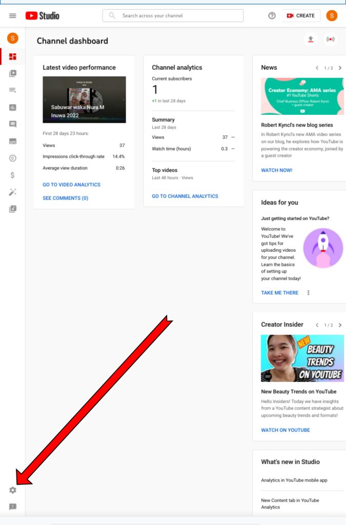 bayan kayi click zai sauya izuwa wata subuwar fuskar studio din, sai ka duba can kasan YouTube studio din zaka ga wata yar alamar setting yar karama daga can kasa